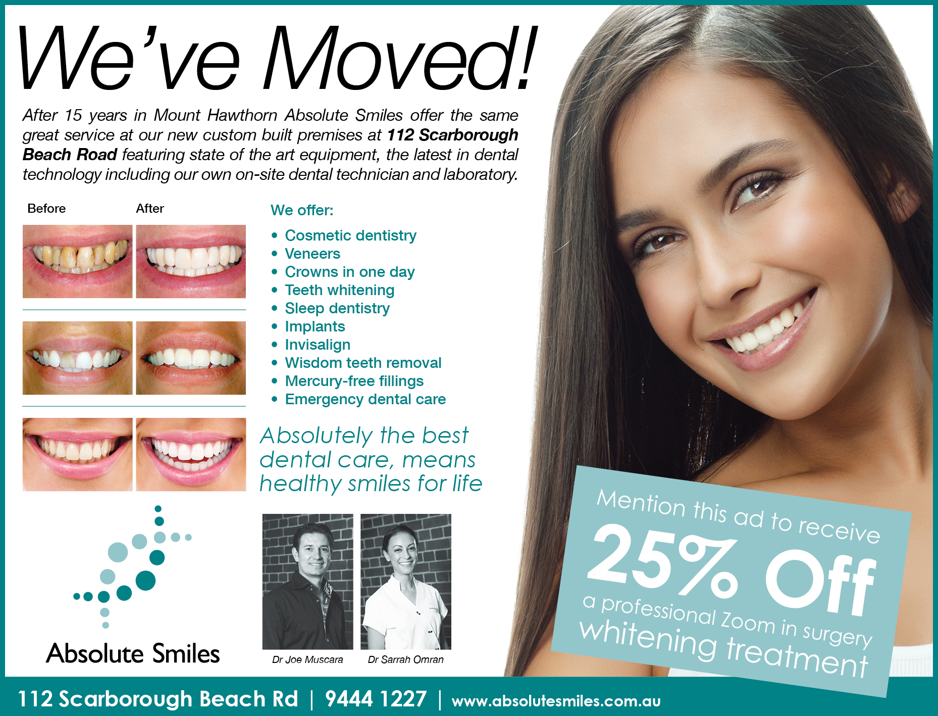 Absolute Smiles has been looking after patients in Mt Hawthorn and surrounding regions for the last 15 years. The team is led by experienced dentists Dr Sarrah Omran and Dr Joe Muscara.