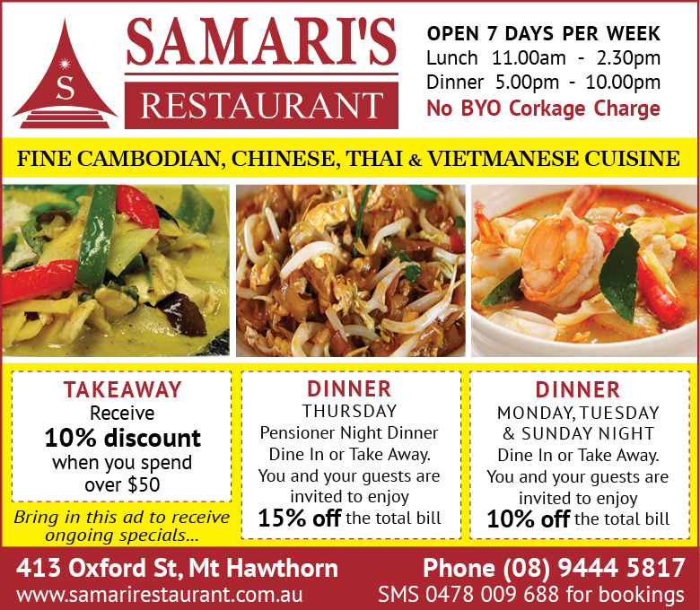 Take a trip around the orient without leaving the country at Samari’s Restaurant. Serving fine Asian cuisine, the extensive menu is a delicious selection of authentic Chinese, Vietnamese, Thai and Cambodian dishes. With so much choice on offer, it’s like having four restaurants in one. Established in 2007, Samari’s was originally located at Victoria Avenue Perth and has recently relocated to more spacious premises in Mt Hawthorn.