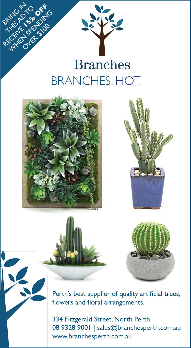 Branches on Fitzgerald St is WA’s best supplier of the highest quality artificial trees, plants and floral arrangements. In business for over 25 years, Branches is going strong and about to open a second store located in Erindale Road, Balcatta.