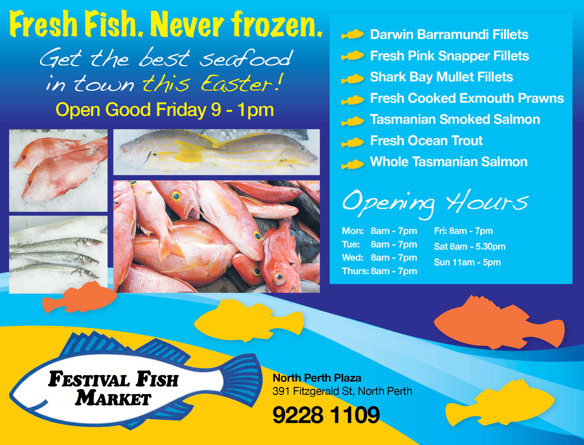“All our fresh fish is absolutely fresh, straight off the boat every day, never thawed,” Gavin says. “Frozen fish is in the freezer.” Festival Fish North Perth is staffed by the familiar and friendly faces of Alcino, Amol, Marylyn and kae, it is open 7 days (8am to 7pm Mon–Fri), 8am to 5.30pm Sat and 11am to 5pm Sun.
