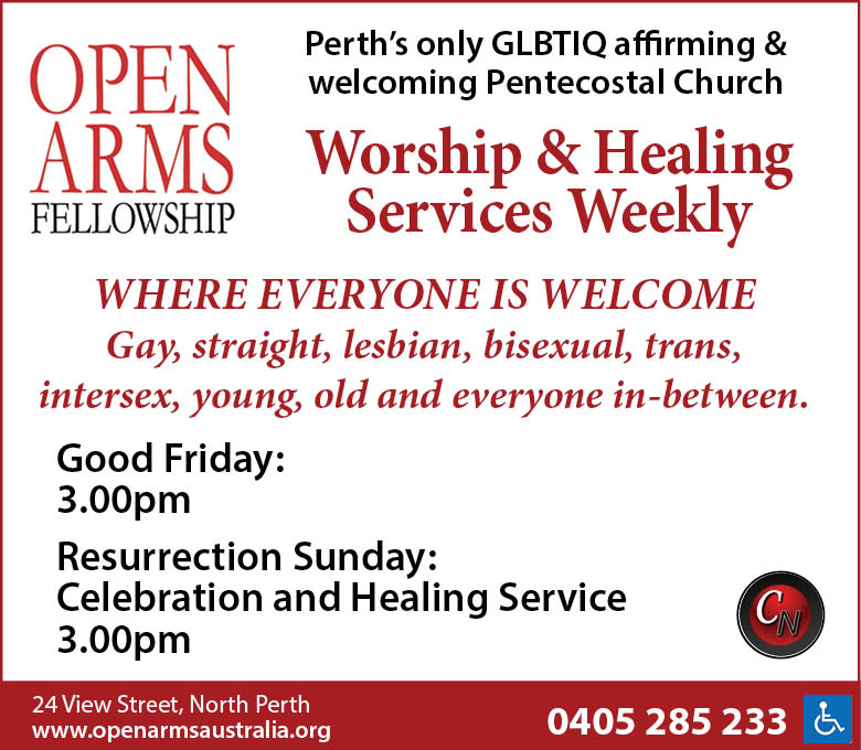 Open Arms Fellowship, the only welcoming and affirming Pentecostal church in Perth. The fellowship started two years ago, with the aim to provide a safe and welcoming space for everyone including gays, lesbians, bisexual, trans, and intersex people to express their love and worship for Christ.