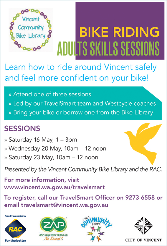 CYCLISTS might soon be able to ride on the footpath under new state government legislation, but until then many newbie cyclists remain fearful of riding on the road. Westcycle and the RAC are holding adult bike skill sessions for folks who never learned the basic laws of helmets, bells and lights, road rules, or how to take off in a properly postured “power position”. There are three sessions (free for Vincent residents, $10 for aliens), May 16, 20 and 23 at the Loftus Street carpark, call 9273 6558 or email travelsmart@vincent.wa.gov.au to get on board.