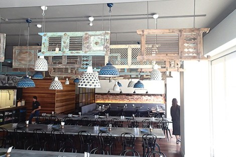 This is modern Indian dining, a cavernous space of polished concrete, raw brick, long tables, huge timber-framed windows onto William and James Streets, and funky blue and white light fittings—lots and lots of them—interspersed with shabby-chic timber screens high overhead.