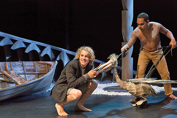 “You’re always aware that they’re puppets and there’s no pretense there,” Holloway says. “They’re designed to look like they’ve been put together by things that washed up on the beach. They’re puppeteered by two indigenous performers who are a constant presence throughout the work.