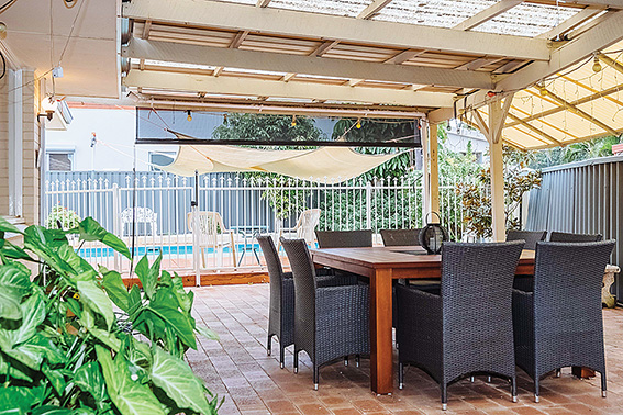 From here you step out into the alfresco area, a generous space sheltered from the weather with a solid roof and a lushly planted garden.