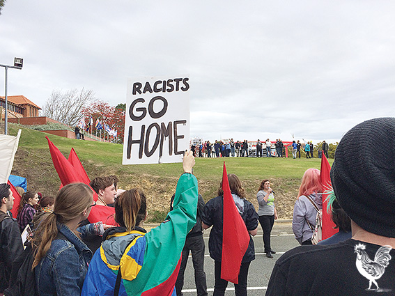 This display raised a wave of middle fingers as well as boos and chants of “fuck off, racists” and the occasional “Nazi”.