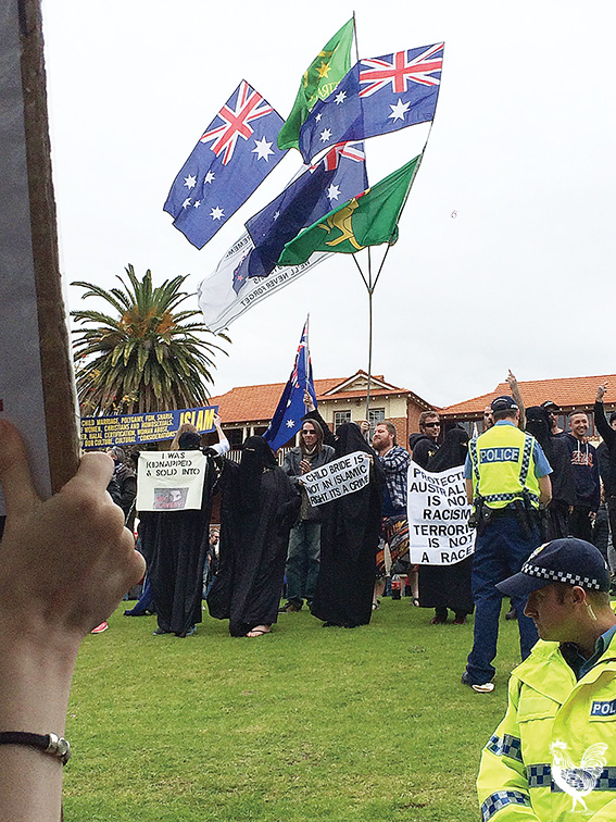 The Perth demonstration reaches its peak when Reclaim Australia members in burqas and orange jumpsuits walk in chains to confront the pro-multicultural crowd. Their banners refer to acts of terror by ISIS and other practices within Islamic countries they find offensive, such as the marriage of children: “I was beheaded for being Christian”, “A child bride is not a Islamic right, it’s a crime” and “Sorry, Lindt Cafe.”