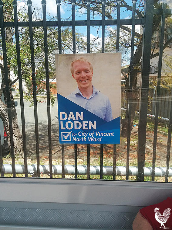 “It’s no secret that I reported the posters to the City of Vincent and returning officer. I only removed one poster off the light pole because it was about to fall off. Opportunistic event,” Mr Rossi said.