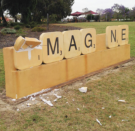 IT’S happened again: blockheads have busted the giant Scrabble-like sculpture at Ellesmere Reserve in North Perth.