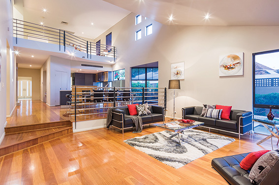 Inside, soaring spaces abound and include an open-plan area with two lounge/family spaces, each with doors leading to the garden and lap pool.