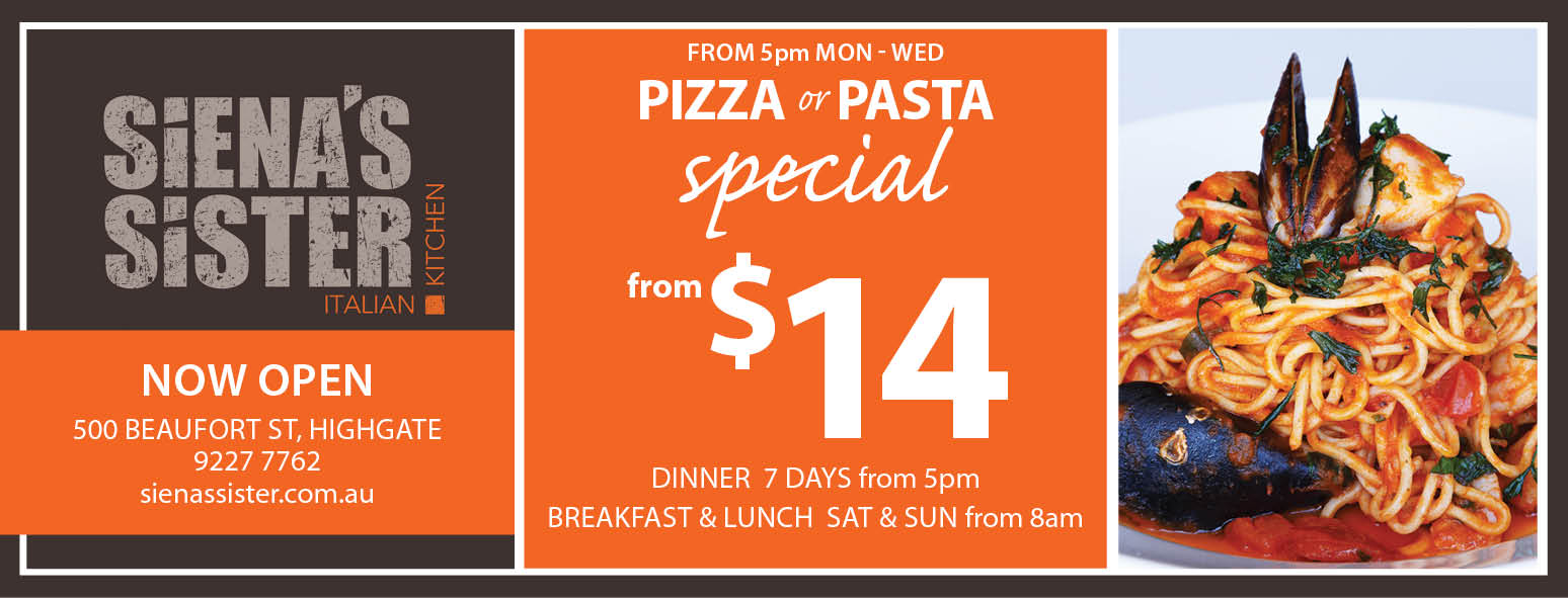 Brothers-in-law Anthony Palassis and Andrew Parissis of Siena’s Leederville are back in Beaufort Street where in 1998 they began their journey into the restaurant business. Their local Leederville institution Siena’s continues as always, but now there’s the new kid on the block in Mt Lawley: Siena’s Sister…yes, the much loved eatery has a younger sister and she’s looking forward to serving you some delicious food from her