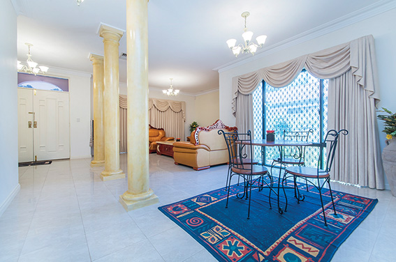A glistening black swing backs onto a massive formal dining/lounge area off a huge entry.
