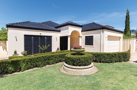 Directly across the road, this four-bedroom dwelling is the epitome of modern Australian homes, with sleek lines and an arched, covered portico sheltering massive double doors.