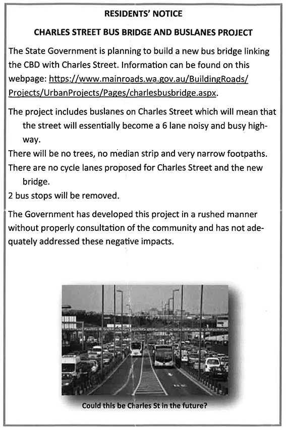Mr Sutherland says he hasn’t heard a single complaint, despite his name and number being on the flyer as a contact: “I never got a single person contact me, — Eleni [Evangel, Perth MP] hasn’t either. It might be another problem that’s not a problem,” Mr Sutherland told the Voice. “Is it another first world problem? It’s another one of these things, — you live in the inner city, you want all the inner city facilities, but you don’t want any change.”