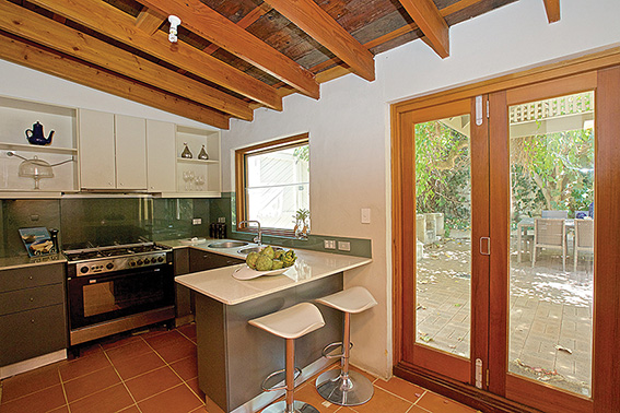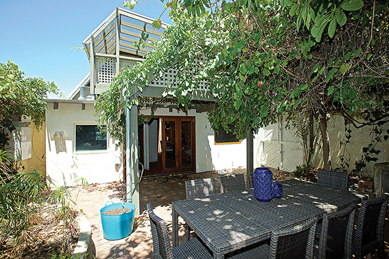 The courtyard garden is a jungle of grape and passionfruit vines, a weeping mulberry, and overgrown garden beds just waiting for a green-thumbed owner to set it to rights.