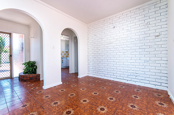 Large burnt orange sunflower tiles blossom in the entry spreading past the ‘70s retro, raw-brick planter box, under the arches in the dining/lounge area and around to the kitchen.