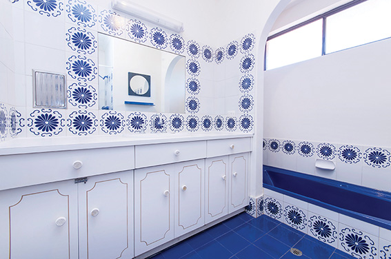And in the second bathroom, with its bold, and beautiful, blue and white, including a royal blue bath, and taps.