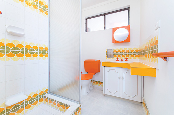 Large burnt orange sunflower tiles blossom in the entry spreading past the ‘70s retro, raw-brick planter box, under the arches in the dining/lounge area and around to the kitchen.