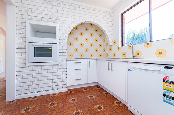 The recently renovated all-white kitchen has a splash of bright yellow sunflowers in tiles on two walls, including in a brick-arched area over the stove.