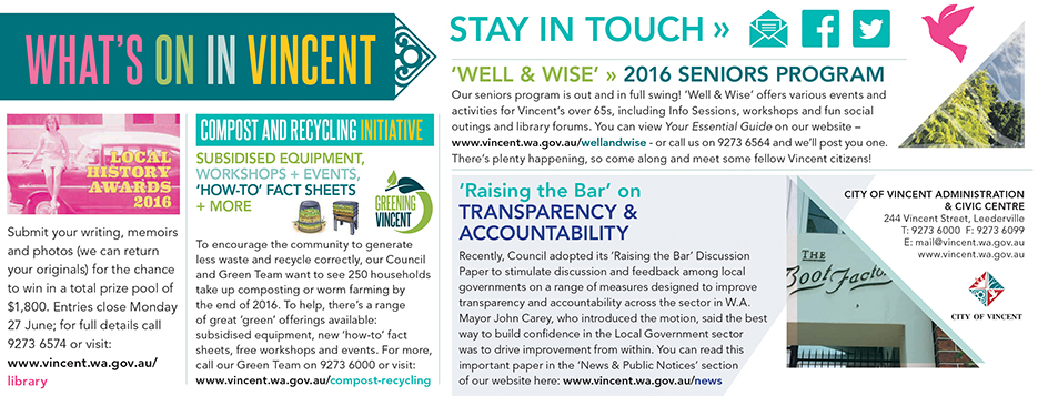 There are three categories for the local history awards (and $1800 in prizes): A written history about life in Vincent, an open award on any topic relevant to the suburbs (the history of your own house is a good starting point), and the photographic memories section for photos more than 30 years old taken within Vincent. It’s open now until June 27 and there’s more info on 9273 6534 or local.history@vincent.wa.gov.au, and if you want to check out that nifty photo database and look up cats of Mount Hawthorn in the 1950s, just head to the Vincent library at http://www.vincent.wa.gov.au/local_history_centre