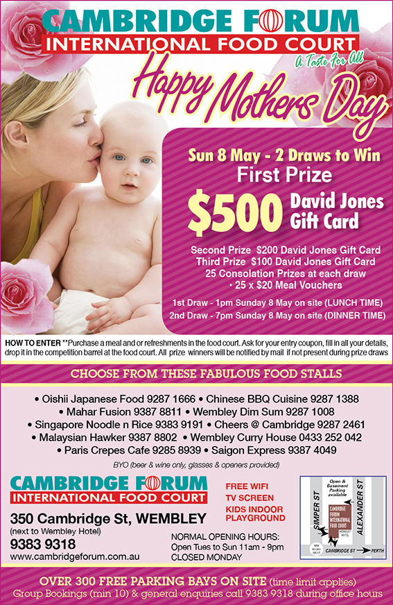 With ten food stalls, The Cambridge Forum International Food Court boasts an amazing array of the best international cuisine the world has to offer. Customers can span the culinary map of the world with Singaporean, Malaysian, Thai, Chinese, traditional Dim Sum, Indian, Japanese and French food all under the one roof. Finish your international taste trip with a selection of delectable cakes, pastries, tea and barista made coffee. (BYO, beer and wine only, glasses provided).