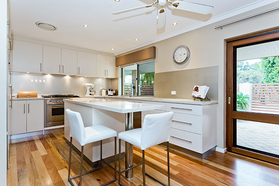 White caesar stone tops, including an expansive island and a heap of soft-close drawers and double pull-out pantries ensure no complaints from whomever is on cooking duty.