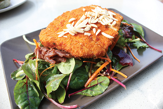 My companion took a nanosecond to choose the crumbed chicken breast with caramelised onion.