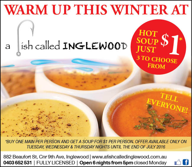 With 3 different soups, it’s going to be hard to choose! It might be nourishing leek + potato, or creamy snapper chowder or seafood soup. *Offer available only on Tuesday, Wednesday and Thursday nights until the end of July 2016….Tell everyone! As you would expect, A Fish Called Inglewood is family-friendly, fully licensed and BYO bottled wine. Take away orders can be taken from 4.30pm for pick up at 5pm.