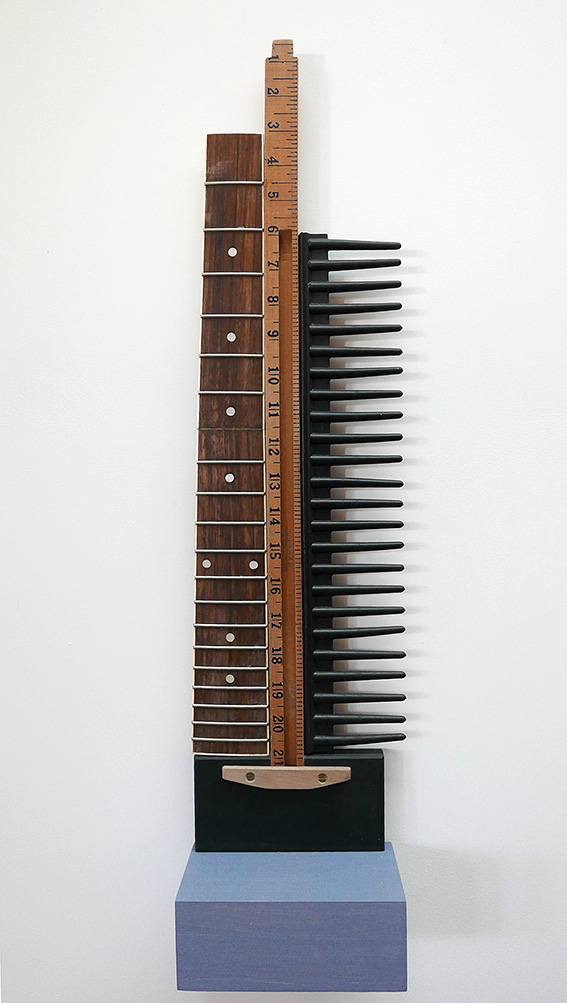 Other objects came from an old friend who willed him the contents of her huge shed, including a piece in the show that’s not for sale: “It’s my talisman,” Koning says of the timber slab cross-hatched with deep cuts.