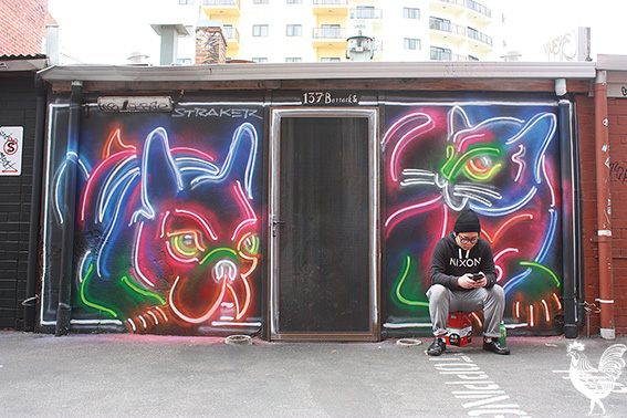 ARTIST Drew Straker’s got a new piece up in Grand Lane behind Barrack Street. He’s credited by street art website allthoseshapes.com as “probably the first” artist to use this neon glow technique, with white lines under the transparent colours, making his Barrack Street bulldog and kitty really pop.