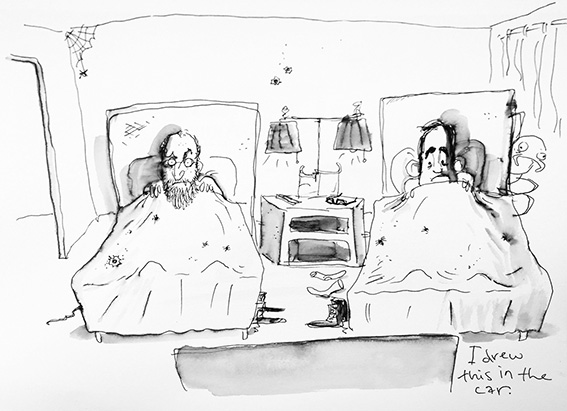 The whole illustrated tale with all his scribblings done from the passenger seat are online at bit.ly/halfasscomedy