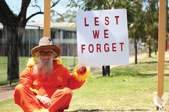 Dressed as the Lorax and bearing a sign that reads “lest we forget,” he’s been chatting to every passerby about the trees.