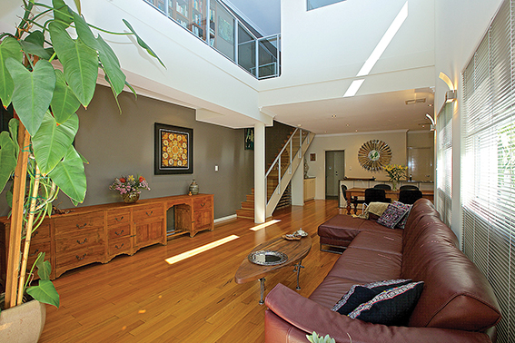 An elegant gantry walkway lined with a stylish timber bookshelf, looks down on the dining/lounge area below.