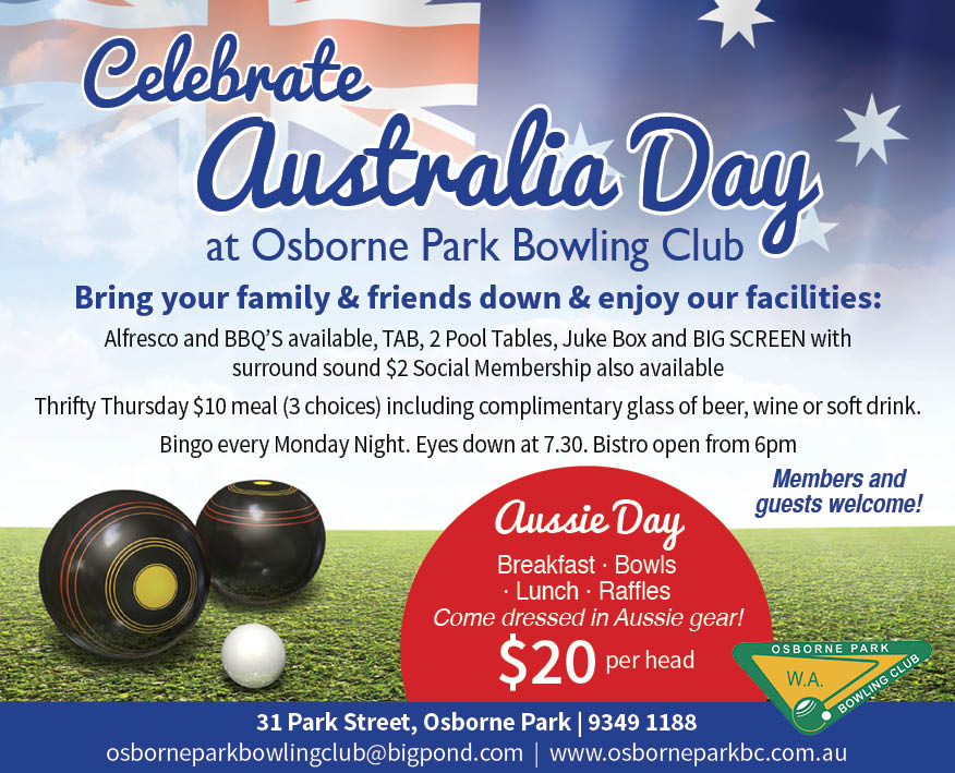 Celebrate Australia Day this year with a special event at Osborne Park Bowling Club. It includes breakfast, bowls (provided), lunch and raffles all for the price of $20 per head. The only thing you have to do is dress up in your Aussie outfits. This is a family friendly day, where everyone is welcome.