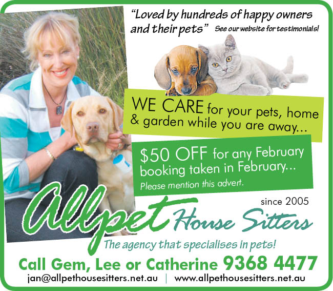 Are you planning a holiday but don’t know what to do with your beloved pets? Choose a ‘live-in sitter’ instead of the kennels. Your pets will love you for it and you will be able to afford to holiday more! An Allpet House Sitter costs about $440 for a month and that gives you a reliable pet lover who will care for your pets, garden and house. All sitters are police cleared and insured.