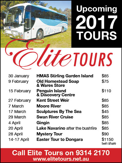 As a family owned business with over 20 years experience, Elite prides itself on providing personalised customer service to make your trip one to remember. So come and join Kevin and Sue Oliffe and the Elite Tours team on a great day out. Membership is free. For further information, please call 9314 2170 between 9am to 5pm Monday to Friday or visit http://www.elitetours.net.au