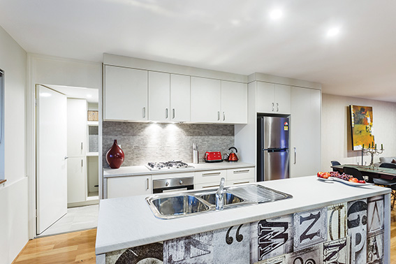 With its light-grey and white bench tops—including an island/breakfast bar—grey stone splash back, floor-to-ceiling pantry and Miele appliances, cooking couldn’t be easier.