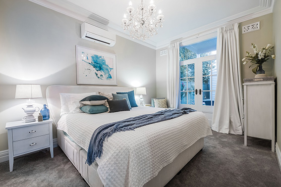 The generous main bedroom, with french doors to the rear garden, has a chandelier.