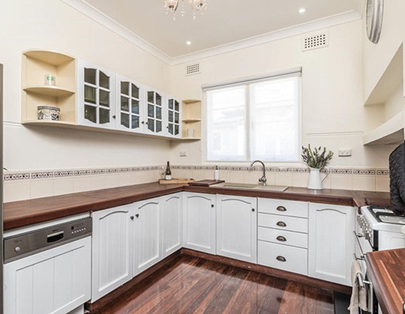 The kitchen’s been done up beautifully, and I suspect one of the design briefs was to add some bench space, as cooks from bygone eras apparently had the whole compact thing down pat. Perhaps its our modern fascination with gadgets, but whatever it is I’d certainly appreciate the extra room on these chocolatey jarrah benchtops. The simple white cupboards have been well chosen to complement the rounded deco features throughout the house, while a line of tiles ties the whole lot together.