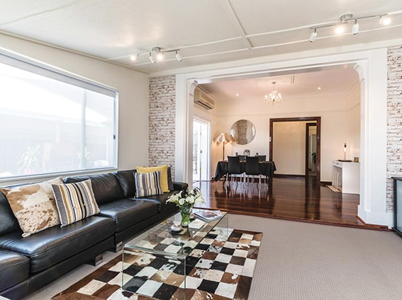 A 1930s art deco gem, you’re welcomed by a small “mud room” which seems to have been added sometime later; it’s where you can store your fedora, grey fox fur or Malvern Star, or simply dump your Blundies there until you’ve got time to scrub off the red Pilbara dust.