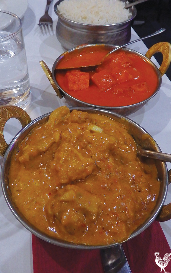 After much deliberation we settled on the ‘chef recommended’ chicken madras ($19.50), paneer makhani ($17.50), garlic naans ($4) and basmati rice ($4).