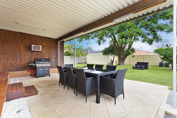 A family room isn’t really required as there is a spacious lounge, where timber-framed double doors and windows onto the front verandah reflect the home’s 1960s vintage.