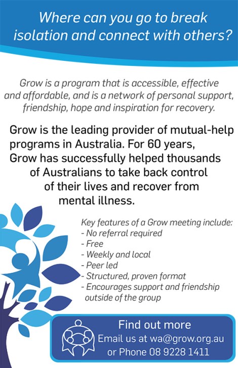 Developing understanding, acceptance, confidence, control and love is at the heart of the Grow program. Meetings are supportive, non-threatening, positive and constructive and you don’t require a doctor’s referral to attend. Members are known in their group on a first name basis only and make a commitment to confidentiality. No fees are charged, however a small donation to meet necessary expenses is usual, though strictly voluntary.