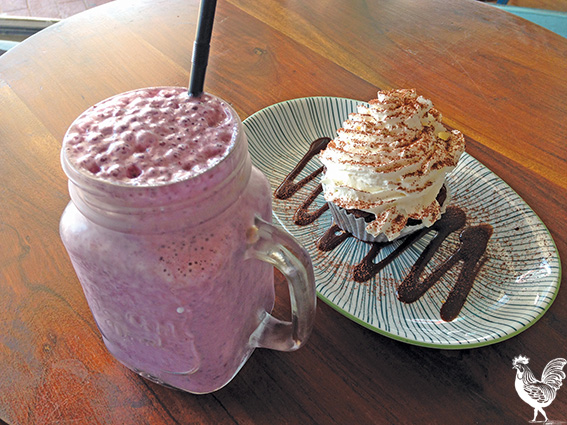 I couldn’t go past the berrylicious smoothie ($7.50)—blueberry (hmmm…), raspberry (well…), banana (hang on), and honey (ok, so the sugar-free idea’s out the window) churned up with milk.