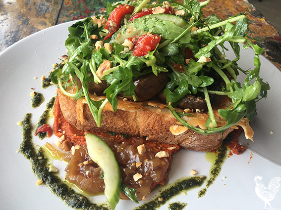 The chunky slice of toast was laden with mushrooms, rocket, capsicum, cucumber and hazelnuts.