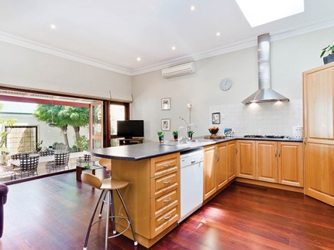 Out the back the kitchen’s gorgeous, and it looks over the lounge into the tranquility of the rear courtyard, making it the perfect for preparing meals and then serving them up to some guests (thereby chalking up some karma points).