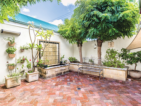 My three-year-old went to some higher plane when she discovered the small fish pond in the rear courtyard of this beautifully renovated federation terrace home. Usually a fidgety chatterbox, she became as mute and motionless as a statue of Buddha while watching their gentle to and fro. With the tinkle of water splashing from the tiled water feature into the pond, and a neat assortment of leafy, hanging baskets and frilly trees, I can see why the owner loves to escape here and find her inner peace.