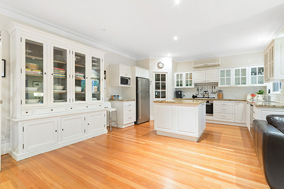 Sparkling white cupboards in the huge kitchen, with a walk-in-pantry, are topped by caramel-brown granite tops—a warm tone that picks up the honey gold of the timber floor.