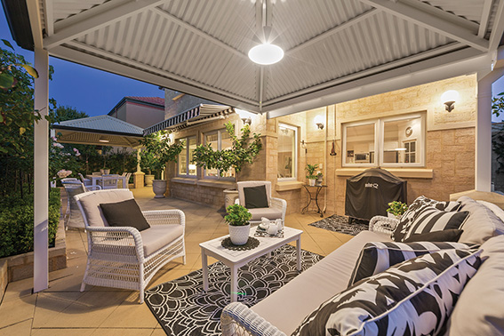 There are two peaked-roofed sitting areas: one sheltering the barbecue, the other making for elegant alfresco dining.