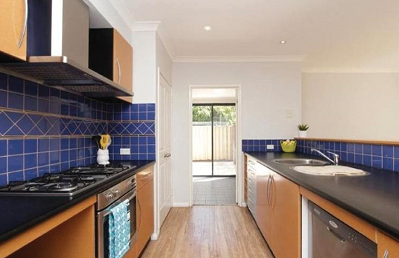 More golden timber fronts the cupboards, including a double pantry, in the galley-style kitchen with its attractive blue-tiled splash back.